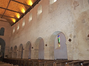 | Elévation de la nef 身廊の南側の縦構造は今なお2層で、インポストがある方形のピラーからのぼる6つのアーケードの上に、6つの小さな高窓があります。 身廊北側の壁はゴシック期にほぼ完全に再建されており、開口部は16世紀に造られたものです。 L'élévation de la nef du côté sud, reste deux niveaux : six arcades en plein cintre sur des piliers carrés avec impostes, sont surmontées chacune d'une petite fenêtre haute. Le mur nord de la nef, presque entièrement reconstruit à l'époque gothique, est percé des fenêtres du 16e siècle. |