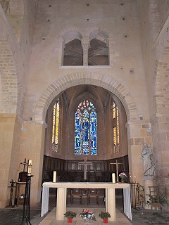 | A la croisée du transept, s'élève une tour lanterne de plan octogonal, rasée à la fin du 18e siècle. Le choeur gothique de la fin du 15e siècle est percé des fenêtres en lancette à remplages. | ||