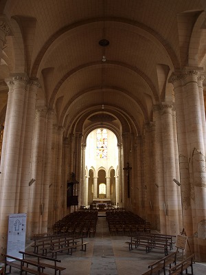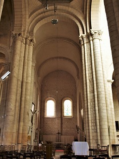 | 現存の身廊は8ベイからなり、天井は円筒型ヴォールトで覆われています。 1562年のユグノーによる破壊行為によって身廊と鐘楼は脆くなり、1643年一部崩落しました。1643から1644年にかけて、身廊は修復されますが、天井はロマネスク時代より5メートル低くなりました。またこの時、損傷を受けていた西側の2ベイはロマネスクのファサードと共に削り取られ、そして新しいファサードが造られました。 18世紀末、鐘楼が再び崩落し、それと共に身廊のヴォールトも崩壊しました。 |