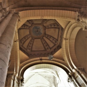 Croisée du transept 18世紀末、交差部の上に聳えていた鐘楼は崩落し、これにより交差部の天井を覆っていた交差ヴォールトは破壊されました。19世紀、交差部の天井はトロンプ技法によるクーポルで修復されました。 A la fin du 18e siècle, l'effondrement du clocher sur la croisée, a provoqué la déstruction de la voûte d'arêtes, qui y couvrait promitivement. Au 19e siècle, la croisée a été restaurée en coupole sur trompes. |