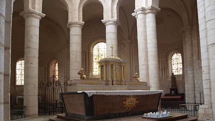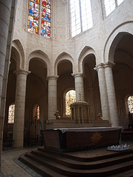 | 2ベイからなる内陣は、13世紀に再建されました。ここでは4本の円柱がRond-pointを形作っています。ゴシックの建築の中にも、ロマネスクの柱とアーケードは残されています。 ユグノーによる破壊行為の後、内陣は17世紀に修復されました。モザイクは1896年に設置されました。 |