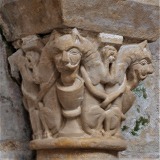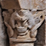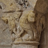 | 1817−1822年の修復工事の際、内陣と周歩廊にあった大半のロマネスクの柱頭彫刻は破壊されるか、或いはミュゼ・サント・クロワに預けられました。これらの柱頭には、卵型やアカンサスの葉の装飾が施された石膏のコルベイユが新たに設置されました。 ミュージアムにて保管されている柱頭の中に、ゾウを彫ったものがありますが、これはゾウを表現したフランスで最古の柱頭彫刻です。 |