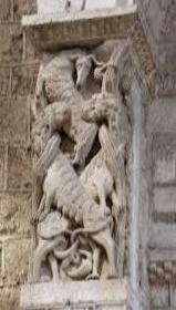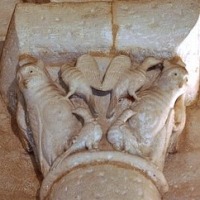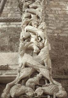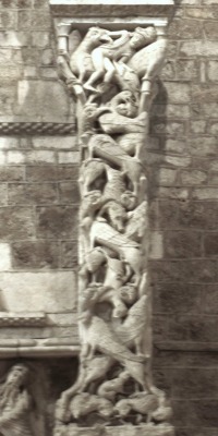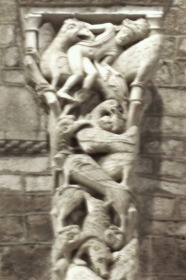 Pilier de Souillac : face côté à la nef ; la conséquence du péché 身廊側の面には、様々な非実在の動物や鳥と人間とが入り乱れる様子が描かれます。これは地獄絵図であり、罪を犯した結果を表しているとされます。ここでは地獄に堕ちた人間達が、交錯し、身をよじらせた様々なモンスターの餌食となっています。 La face côté à la nef, présente un enchevêtrement d'animaux ou d'oiseaux fantastiques, et de personnages. Il s'agit d'une scène d'enfer, représentant probablement la conséquence du péché : ici, des damnés sont la proie des monstres divers qui se croisent et se tordent. このピラーはモワサックのサン・ピエール修道院教会の中央柱から直接的にインスパイアされて制作されていますが、スイヤックのこのピラーの方がより活き活きとしてダイナミック、或いは混沌とした印象です。 Cette face est directement inspirée du trumeau de l'abbatiale Saint-Pierre de Moissac, toutefois le pilier de Souillac est plus vivant et dynamique, ou chaotique. |