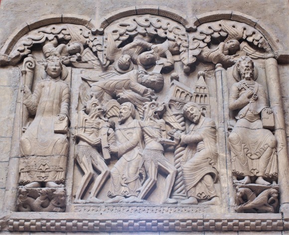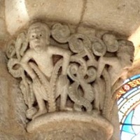 | Portail roman 身廊奥、オルガンの下、ナルテックスからのアクセス周りに、様々なレリーフが配されています。 これらレリーフは塔ポーチの北側の旧入り口を形作っていたものと考えられています。 北入り口は16世紀、宗教戦争時に大きな被害を受け、17世紀に再建するために取り壊されました。そしてこの時残されたパーツが教会堂内部にて復元されました。 1125-1150年頃に制作されたこの彫刻群は、身体の細長いプロポーションと平面的な表現を特徴とするトゥールーズ派の傑作のひとつです。 この彫刻群は、同じ流れをくむモワサックのサン・ピエール修道院教会の南入り口や、ボーリューのサン・ピエール修道院教会の南入り口と比較されます。 |