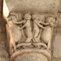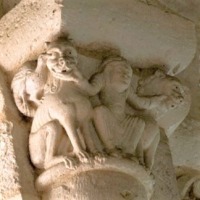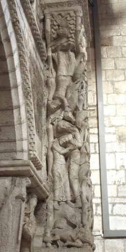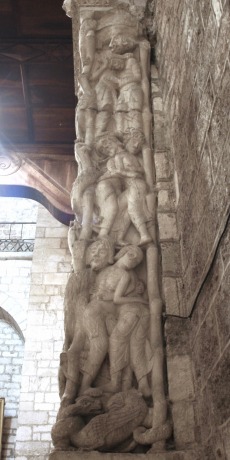 | Pilier de Souillac : face nord ; le péché ピラーの北面には、年輩者と若者との3組のペアが描かれています。彼らの多くは上半身裸で、取っ組み合い、闘い、暴力をふるっています。 これらの人物達は、高慢・抑圧・欲望といった罪を犯す根源となるものを表現していると考えられます。 La face nord du pilier illustre trois couples d'un vieillard et un jeune, qui sont pour la plupart torse nu. Ils s'enlacent, se luttent et se violent. Ils représentent probablement les origines du péché : orgueil, oppression, et concupiscence. |