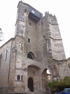 Clocher-porche 方形プランで4層からなる鐘楼ポーチは、1573年にユグノーより受けた被害の爪痕を今日も残します。 De plan carré et de quatre niveaux, le clocher-porche laisse des traces de dégâts, subis par les Huguenots en 1573. |