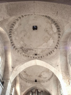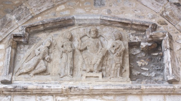 | Tympanroman : leChrist engloire 身廊に繋がる半円型の入り口の上に、12世紀半ばに遡るレリーフが埋め込まれています。これは旧西入り口のタンパンを飾っていたものと考えられており、カオールのサン・テティエンヌ大聖堂のタンパンとの類似性も指摘されます。 タンパンは栄光のキリストを描きます。 十字のマークがあるニンブスを戴くキリストは右手で祝福のポーズをし、左手に本を持ち、聖母マリア(左)と聖ヨハネ(右)の間で玉座についています。 これら3人の人物を2人の天使が取り囲むのですが、一方の天使しか残りません。 |