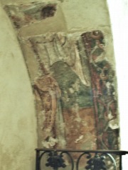 Narthex 17世紀の北入り口を通り狭いポーチを抜けると、交差ヴォールトで覆われたナルテックスがあります。 Passant par le portail nord du 17e siècle, puis traversant le porche étroit, on arrive au narthex, voûté d'arêtes. Fragments des fresques ナルテックスには壁上にフレスコ画の痕跡/断片が見られます。12世紀半ばに制作されたこれらフレスコ画は、サン・サヴァン・シュル・ガルタンプにあるサン・サヴァン・エ・サン・シプリアン修道院教会の天井画を想起させます。 これらは他の場所から持ってこられたものと考えられますが、本来の場所は特定されていません。 Le narthex présente des fragments des fresques, réalisées dans le milieu du 12e siècle. Ils rappellent les fresques de l'abbatiale Saint-Savin-et-Saint-Cyprien de Saint-Savin-sur-Gartempe. Ils auraient été probablement déplacés d'ailleurs, mais on ne sait pas leur provenance. |