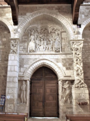 Au fond de la nef, au-dessous de l'orgue, autour de l'accès depuis le narthex, sont disposés de différents reliefs. Ils sont provenant probablement de l'ancien portail nord. Celui-ci a été gravement endommagé par les Huguenots au 16e siècle lors des guerres de Religion, et puis démoli au siècle suivant pour reconstruire : des fragments conservés de l'ancien portail ont été reconstitués dans l'intérieur de l'église. Réalisé dans le deuxième quart du 12e siècle, cet ensemble sculpté est un des chefs-d'oeuvre de l'Ecole Toulousaine, qui se caractérise par la proportion très allongée et le modèle plat. Il est comparable au portail sud de l'abbatiale Saint-Pierre de Moissac ou à celui de l'abbatiale Saint-Pierre de Beaulieu-sur-Dordogne, de la même lignée. |