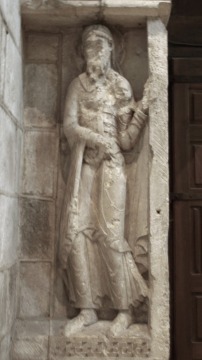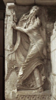 Deux statues : prophète Isaïe 入り口の右側には、預言者イザヤ像があります。YSAIASの銘があります。この彫像は非常に保存状態が良く、高さ2.10メートル程で、スイヤックの修道院教会が誇る傑作のひとつです。 Le côté droit de la porte est occupé par la statue du prophète Isaïe (YSAIAS). Très bien conservée, la statue d'Isaïe d'environ 2,10 m de hauteur, est un des chefs-d'oeuvre de Sainte-Marie. イザヤは肩や胸元で髪と顎髭の長い束を波打たせ、ダンスをするかのように長い脚をクロスさせています。特筆すべきはしなやかな衣服の刺繍や襞の表現にあり、ここに職人の繊細な仕事を観察することができます。 イザヤは嬉しそうにフィラクテールを見せ、とある処女から救世主が誕生するという嬉しい知らせを告げています。 Portant les longues mèches ondulées de sa chevelure et de sa barbe sur ses épaules et sa poitrine, Isaïe semble de danser en se croisant les longues jambes. On peut observer la délicatesse du travail du sculpteur surtout sur les broderies et les drapés de ses vêtements souples. Le prophète montre un phylactère déroulé avec joie : il annonce l'heureuse nouvelle de la naissance du Sauveur enfanté par une vierge. このイザヤ像は、モワサックのサン・ピエール修道院教会を飾るエレミヤ像を彷彿とさせます。 Cette statue rappellent tout à fait celle du prophète Jérémie à l'abbatiale Saint-Pierre de Moissac. |