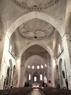 Nef 身廊は単身廊で、その2ベイはクーポルで覆われています。 側壁は半円型の3つ連続したブラインド・アーチで装飾され、その上、高さ9メートルの位置にギャラリーがあります。ギャラリーの上には、小円柱で装飾された半円型の開口部が各ベイに2つずつ設けられています。 La nef unique est de deux travées, coiffées de la coupole sur pendentifs. Les murs latéraux sont ornés de trois arcatures aveugles en plein cintre, au-dessus desquelles se trouve la galerie, qui court 9 m de hauteur. Celle-ci est surmontée par travée, de deux fenêtres en plein cintre, ornées de colonnettes. |