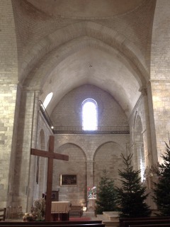 Transept トランセプトは横方向に張り出していて、翼廊は1ベイで尖頭型ヴォールトに覆われています。トランセプトの縦構造も2層ですが、側壁の半円型の連続アーチは2つで、開口部は1つです。 Le transept est saillant, dont les croisillons d'une travée sont voûtés en berceau brisé. L'élévation du transept est également de deux niveaux, toutefois deux arcatures aveugles en plein cintre sur les murs et une fenêtre haute. 翼廊にはそれぞれ東側に多角形プランの後陣祭室があります。北後陣祭室は聖ヨセフを、南後陣祭室は聖母マリアを祀ります。後陣祭室は1840年代に再建されています。 Les croisillons donnent chacun sur une absidiole orientée en polygone, reconstruite dans les années 1840 : l'absidiole nord est dédiée au saint Joseph, et celle sud à la Vierge. トランセプト交差部には、主祭壇が設置されています。交差部を覆うクーポルは、身廊のクーポルに似ていますが、より大きくて深さもあり、基部にギャラリーはありません。 La croisée du transept abrite le maître-autel. Sa coupole est semblable à celles de la nef, mais plus grande, plus profonde, et dépourvue de galerie à sa base. |