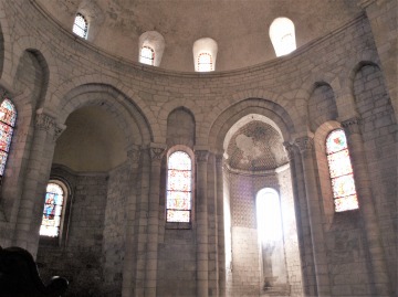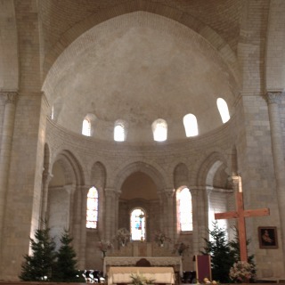 | Abside アプスはセミ・ドームで覆われていて、壁の山高のアーケードの中とドームの基部とに開口部が設けられています。 アプスには3つの多角形プランの放射状祭室があり、尖頭型のアーケードで開かれます。 Voûtée en cul-de-four, l'abside présente deux niveaux de baies en plein cintre, sous les arcades rehaussées sur les murs, et à la base de la voûte. L'abside s'ouvre sur trois chapelle rayonnantes polygonales par des arcades brisées. |