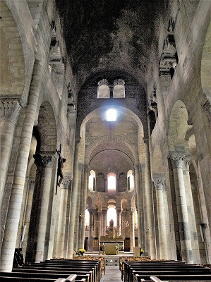 Plan ラテン十字型をした教会堂は、4ベイの三身廊、トランセプト、周歩廊に囲まれた内陣で構成されます。 Notre-Dame de Saint-Saturnin en croix latine orientée, se constitue de trois vaisseaux de quatre travées, d'un transept, et d'un choeur entouré d'un déambulatoire. Nef 中央身廊は、トリビューンの半円筒型ヴォールトに支えられた円筒型のヴォールトで覆われます。1番目と2番目のベイの間に唯一の横断アーチが見られ、これは円柱に繋がります。 La nef centrale est voûtée en berceau en plein cintre, contrebuté par les demi-berceaux des tribunes. Entre la première et la deuxième travées, le seul arc-doubleau retombe sur les colonnes engagées. |