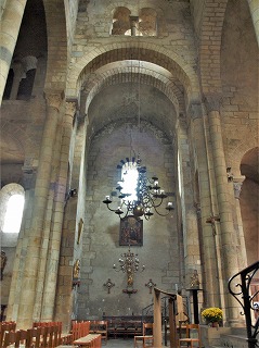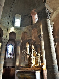 Choeur 階段を3段のぼった位置に造られた内陣は、円筒型のヴォールトに覆われた1ベイと、セミ・ドームに覆われた半円プランのアプスで構成されます。 内陣は、植物モティーフの柱頭彫刻がある6つの円柱に支えられたアーケードに囲まれています。アーケードのアーチは縦長の半円型になっています。 アーケードの上には、半円型のアーチが5つ並び、アーチは交互に開口部になっています。 Le choeur surélevé de trois marches, se constitue d'une travée droite, voûtée en berceau en plein cintre, et d'une abside hémicirculaire en cul-de-four. Cet ensemble est encadré de l'arcade surhaussée, reposant sur six colonnes à chapiteaux sculptés de motifs végétaux. Elle est surmontée de cinq arcatures, alternativement aveugles. |