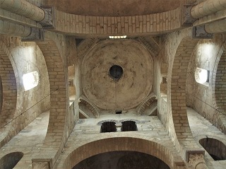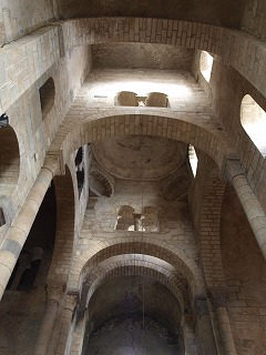 Croisée du transept トランセプト交差部はトロンプ技法によるクーポルで覆われています。クーポルは対になった開口部がある4つのダイアフラム・アーチに支えられていて、このアーチを支える方形のピラーには、3つの円柱が備わっています。 La croisée du transept est couverte d'une coupole sur trompes. Celle-ci est soutenue par quatre arc diaphragmes percés de baies géminées, reposant sur les piliers carrés avec trois colonnes engagées. |