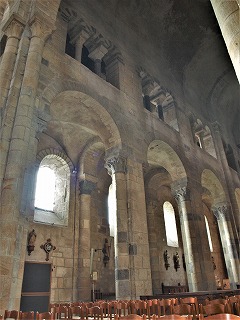 | 身廊と側廊の間には半円型のアーケードが並びます。このアーケードは柱頭彫刻を戴く3つの円柱が組み込まれたピラーに繋がります。 この大アーケードの上に、トリビューンの3つ一組になった半円型の開口部が見えます。 |
