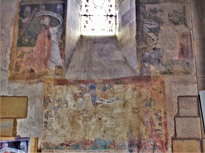Fresques 北側廊の2番目のベイに、16世紀初めに制作された、受胎告知とラザロの復活を描いた壁画が残ります。 このベイでは葬儀が執り行われていたと考えられています。 Dans la deuxième travée du bas-côté nord, sont visibles des peintures murales datant du début du 16e siècle, représentant l'Annonciation et la ressurection de Lazare. Cette travée aurait êtê utilisée comme chapelle funéraire. |