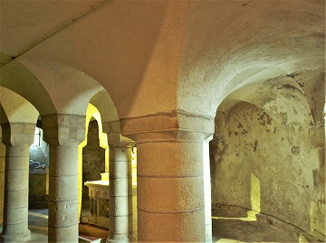 | 内陣の下に位置するクリプトには、脇にある階段からアクセスします。 クリプトは内陣と同じプランです。但し中央スペースには、上部の内陣の床を支えるために、4つの円柱が付け加えられています。 交差ヴォールトで覆われたクリプトは装飾が少なく、3つの開口部があります。円柱には柱頭がありません。 Située au-dessous du choeur, la crypte est accessible par deux escaliers latéraux. Elle reproduit le plan du choeur. Toutefois, se trouvent quatre colonnes supplémentaires dans l'espace hémicirculaire pour supporter la pave du choeur. Voûtée d'arêtes, la crypte sobre est éclairée par trois baies : les colonnes massives sont dépourvues de chapiteaux. |