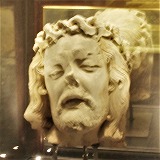 | またクリプトには、16世紀に制作された、茨の冠を戴いたキリストの頭部が展示されています。これは以前は壁の中に埋め込まれていました。 La crypte expose également la tête du Christ couronné d'épines, sculptée du 16e siècle, précédemment encastrée dans un mur. |