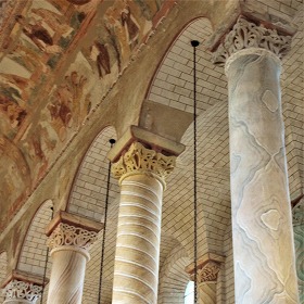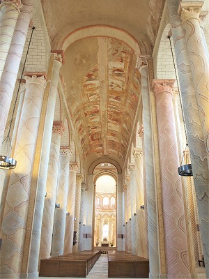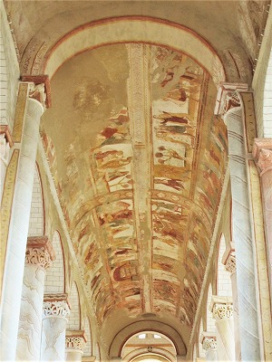 | 地面から17メートル以上の高さにある、長さ42メートルにわたる身廊のヴォールトは、全面が11世紀末に制作された壁画で覆われていて、その表面積は460m2にのぼります。 Long de 42 m et haute de plus de 17 m du sol, la voûte de la nef, est entièrement recouverte de peintures datant de la fin du 11e siècle, sur une surperficie de quelques 460 m2. 身廊のヴォールトには、旧約聖書の創世記と出エジプト記のエピソードが描かれています。 元来ヴォールトには61のエピソードが描かれていましたが、このうち残っているのは44のエピソードで、これらの中にも損傷が激しく、理解が困難なものもあります。14のエピソードは完全に消失していて、3つは取り外されています。 Le programme est consacré aux premiers livres de l'Ancien Testament, la Genèse et l'Exode. Sur les 61 épisodes d'origine de la voûte, 44 sont conservés, dont certains endommagés et peu compréhensibles : 14 ont aujourd'hui totalement disparu et 3 ont été déposés. |