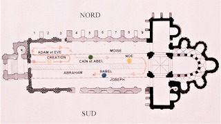 | Eve filant エデンの園から追放された後、イヴは糸を紡いでいます。 Après l'expulsion d'Eden, Eve file sa quenouille. 西側の3ベイ(北側)には天地創造のエピソードが描かれていますが、このうち半分が消失しています。 Les trois premières travées occidentales, côté nord, sont occupées par des épisodes de la Création, dont la moitié est aujourd'hui disparue. |