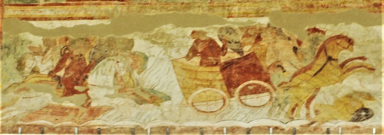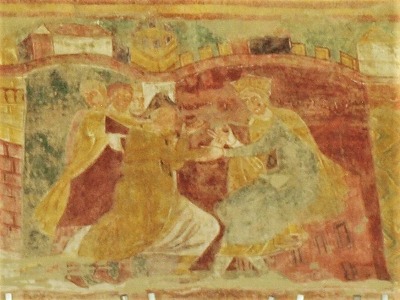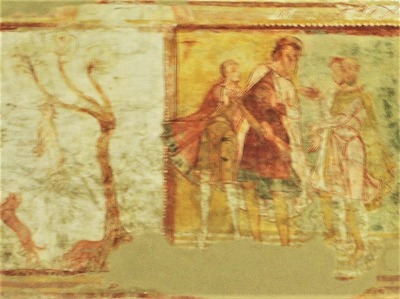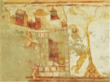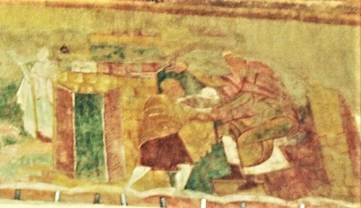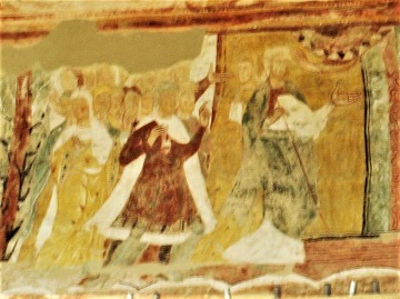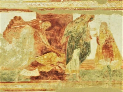 | 場面は中央ヴォールトの全長にわたって中央にはしる大きなフリーズにより、壁画は南北2つに分けられ、更に幅2.5メートルの2つの層に分かれます。 場面の配置は不規則で、聖書の話の流れとは異なる順に場面は配置されています。ワインとパンに関係する場面は、聖体拝領が行われる内陣の近くに配置されています。 尚、概して宗教上ポジティヴな性質を帯びた人物は東、内陣の側を向き、ネガティブな人物は西を向いて描かれています。 |
