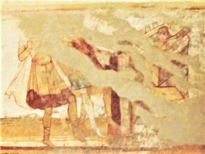 ソドムでエラムの王ケダラオメルらにより捕らえられたロトは、塔の中に幽閉されます。胸壁がある塔の頂で、見張り番が角笛を吹いています。 左側にある3人の人間の脚は、ロトと、ロトを連行して来た人々の脚のようです。 |