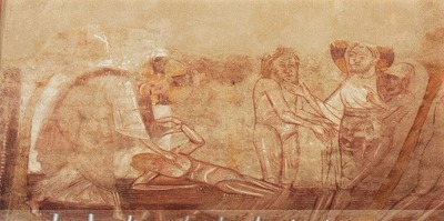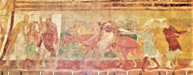 | 修道院の建物の地上階にある食堂にて、今日、身廊のヴォールトを飾っていた壁画(Combat des Rois)を見ることができます。この場面は湿気による損傷が激しかったため、食堂に移されました。 | ||