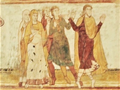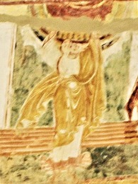 | Registre inférieur nord de la voûte : personification de l'Eglise terrestre ヴォールト北側の最下層には、聖女又はキリスト教会を擬人化した女性が、玉座についています。女性の上に2人の天使の姿があります。 女性は修道院の庇護者に囲まれており、この中に4人のより大きく描かれた人物がいます。彼らは修道院の創立に尽力した人々で、サン・サヴァンを囲う壁を建設したシャルルマーニュ、その息子でベネディクトゥスの戒律を修道院に導入したルイ敬虔王、ポワトゥ伯でアキテーヌ公のギヨーム5世、そして西方修道院制の父であり、サン・サヴァン初代修道院長を務めたアニアヌのベネディクトゥスとされます。 Surmontée de deux anges, la Vierge ou la personnification de l'Eglise, est sur un trône. Elle est encadrée des protecteurs laïques et religieux de l'abbaye, dont sont reconnaisables quatre grands personnages, qui ont contribué à la fondation de l'abbaye : Charlemagne, qui a fait construit les remparts de Saint-Savin, son fils Louis le Pieux, qui a fait introduire la règle bénédictine, Guillaume le Grand, comte du Poitou et duc d'Aquitaine, et Benoît d'Aniane, père du monachisme d'Occident et premier abbé de Saint-Savin. |