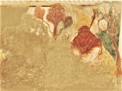 Dieu donne ses instructions à Abraham (à gauche ), et Personnage grimpant dans un arbre 神が右手でアブラハムに祝福を施し、国を去り約束された地に向かうように言います。 右側に、木によじ登る人物の姿があります。 Bénissant Abraham de sa main droite, Dieu lui dit de quitter son pays pour aller vers la Terre promise. A droite, se trouve un personnage grimpant dans un arbre. |