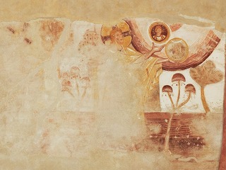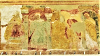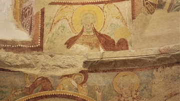 | Peinture de la nef : laVierge à l'Enfant ポーチと繋がる扉の上に、4人の寄進者に囲まれた聖母マリアの母子像を描いた壁画が見えます。これは12世紀後半に制作されました。 |