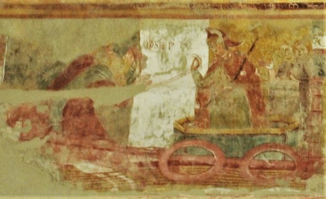 | 玉座についたファラオは褒美として、跪いているヨセフを宰相に任命し、自分のリングを与えます。 | ヨセフはファラオの戦車に乗って群衆の間をまわっています。人々はヨセフにひれ伏しています。 | |