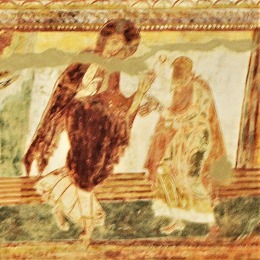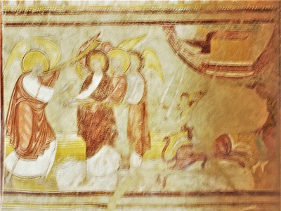 | Au Saint-Savin, Dieu apparaît sous les traits du Christ : à l'époque, il a été souvent représenté par une main sortant du ciel. Et aussi, Dieu est ici figuré plus grand que les hommes. |