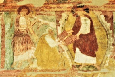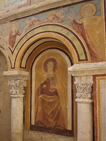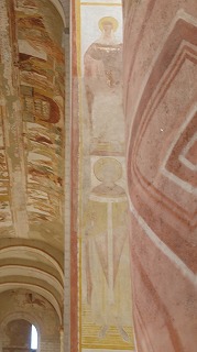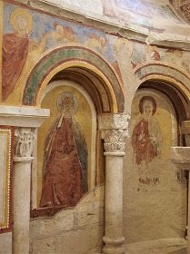 | クリプトは、内陣の下に広がります。クリプトには殉教者サヴィヌスとキプリアヌスの聖遺骨が納められていましたが、既に全て消失しています。 クリプトは、サヴィヌスとキプリアヌスを祀った長方形プランの身廊と、聖人マリヌスを祀った狭い内陣で構成されます。 身廊のヴォールトと壁にはサヴィヌスとキプリアヌスの生涯が描かれています。東側に祭壇が置かれた内陣には、テトラモルフに囲まれた栄光のキリストと、8人の聖人が描かれています。クリプトの壁画は教会堂の身廊やのヴォールトポーチの壁画同様、11世紀末に制作されました。 但しクリプトは、壁画を保存するため公開されていません。 |