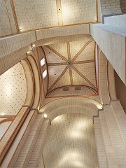 | Croisée du transept 巨大な4つのピラーに囲まれたトランセプト交差部は、交差ヴォールトで覆われています。 外側ではこの上に、小さな方形の鐘楼が聳えます。 La croisée du transept, couverte de la voûte d'arêtes, est supportée par quatre massifs piliers. Au-dessus, s'élève à l'extérieur, un petit clocher carré. |