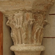 | Chapiteaux de la nef 身廊の西側の3ベイで見られる柱頭は、渦巻きモティーフで装飾されています。 残りの6ベイでは、柱頭には、ポワトゥで典型的な植物モティーフが施されているほか、聖人伝が刻まれた柱頭も幾つか見られます。 Dans les trois travées ocidentales de la nef, les chapiteaux sont décorés de volute. Dans le reste de la nef, les chapiteaux sont ornés de rinceaux et de feuillages gras, de style typiquement poitevin : quelques chapiteaux sont historiés. |