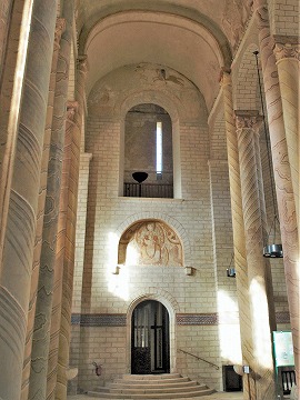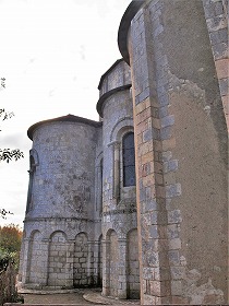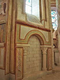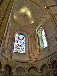 | Chapelles rayonnantes 放射状祭室には半円型の開口部がひとつ、中央祭室には開口部が3つ設けられています。これらの開口部は柱頭彫刻がある小円柱で装飾されています。 開口部の下には、柱頭彫刻がある小円柱に支えられた半円型の連続アーチの装飾が見られます。 Les chapelles rayonnantes sont percées d'une seule baie, excepté la chapelle d'axe de trois baies. Ces baies sont encadrées de deux colonnettes à chapiteaux sculptés. Au-dessous, se trouve l'ornement d'arcatures aveugles en plein cintre, retombant sur les clolonnettes à chapiteaux sculptés . 放射状祭室にはそれぞれ、11世紀に遡る祭壇のテーブル部分が残されていて、また壁画も見られます。 Les cinq chapelles rayonnantes abritent leurs tables d'autel du 11e siècle, et conservent des peintures. |