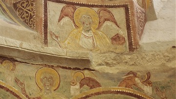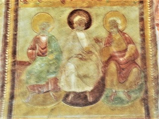 | Sur l'intrados de l'arc-doubleau oriental, encadrant le tympan de la porte à la nef, sont représentés des anges, qui se prosternent devant le Christ, et douze apôtres (six ont disparu) par groupe de trois, assis sur des globes. |