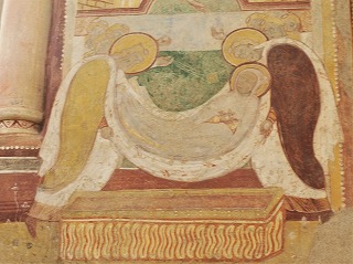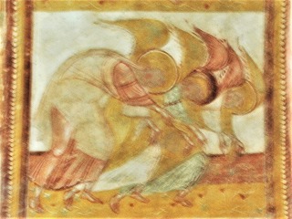 | 身廊への入り口のタンパンを囲むようにしている東側の横断アーチには、キリストに額ずく天使と、12使徒(うち6人は消失)が描かれています。3人ずつ描かれた使徒達は、球形のオブジェの上に座っています。 | ||