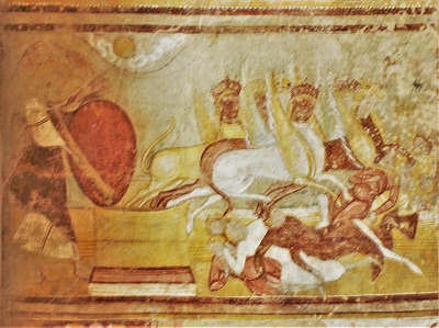 Registre médian sud de la voûte : le combat de Michel contre le dragon (Apocalypse, XII, 7-9) ヴォールト南側の中央のイメージです。黙示録12章7-9節からインスパイアされています。 この場面は、大部分が消失していますが、大天使ミカエルの姿が見えます。 白馬に跨ったミカエルが剣を振りかざし、仲間の天使と共に、ドラゴンに立ち向かっています。 Au registre médian sud, effacé en grande partie, est visible saint Michel. Armé d'épée, et accompagné d'anges, l'archange, qui monte sur un cheval blanc, terrasse le dragon. |