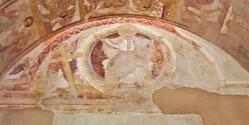 | サン・サヴァンでは、神はキリストのように描かれています。当時は通常、神は天から差し出される手で表現されていました。また神は、人間より大きく描かれています。 | ||