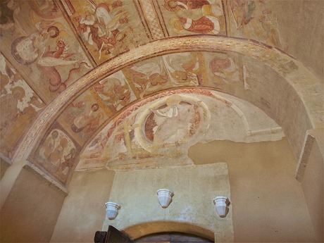 | ポーチでは、身廊への入り口のタンパンに加え、東側の横断アーチと、ヴォールトにも壁画が残ります。 Au porche, il reste les peintures sur l'arc-doubleau oriental, et sur la voûte, ainsi que sur le tympan de la porte. |