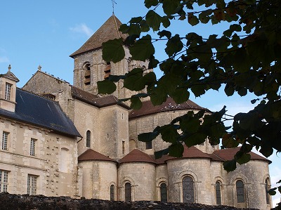 | Flanc sud 修道院教会を南から見たイメージです。 教会堂の南側の側壁は、バットレスで補強されいて、その間に側廊に設けられた半円型の開口部が見えます。 トランセプト交差部に、小さな鐘楼が見えます。 南翼廊の先に、近代の修道院の建物があります。 Le mur sud de l'église est renforcé par les contreforts, entre lesquels sont percées des baies en plein cintre du bas-côté sud. Un petit clocher carré domine la croisée du transept. Dans le prolongement du croisillon sud, se trouvent le bâtiment conventuel moderne. |
