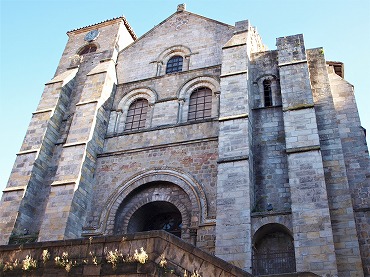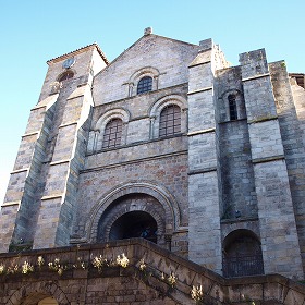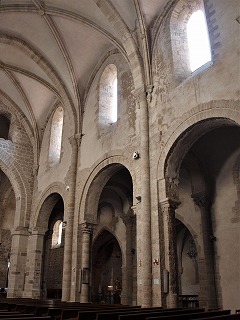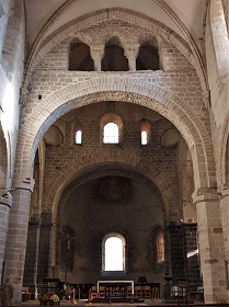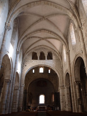 教会堂は長い間閉鎖されていましたが、1970年代の修復工事の後、教区教会として1981年再び扉が開かれました。 Après une longue fermeture, à la suite de la restauration dans les années 1970, l'église paroissiale Saint-Genès a été rendue au culte en 1981. Plan 教会堂は三身廊で、南北にゴシックの祭室を携え、後陣祭室に面したトランセプト、半円プランのアプスで構成されます。 L'ancienne collégiale se constituée de trois vaisseaux, qui flanque les chapelles gothiques, d'un transept ouvrant sur les absidioles, et une abside en hémicycle. Nef 幅9.5メートルもある4ベイからなる身廊は、13世紀よりオジーヴ・ヴォールトで覆われています。創建時身廊は木造天井だったと考えられています。 D'une largeur de 9,5 m, la nef de quatre travées est voûtée d'ogives à partir du 13e siècle : à l'origine, elle devait être couverte en charpente. |