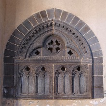 | Enfeu du porche ポーチの壁に、13世紀にヴォルヴィックの石で制作された墓石の飾りが埋め込まれています。 Un enfeu en pierre de Volvic datant du 13e siècle, est encastré dans le mur du porche. |