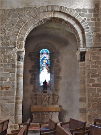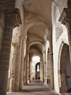 Bas-côté sud 側廊は半円筒型ヴォールトで覆われ、半円型の横断アーチが各ベイを区切ります。 側廊とその脇の祭室は、尖頭型のアーケードで面しています。 Les bas-côtés sont voûtés en demi-berceau, tandis que les arcs transversaux en plein cintre, séparent chaque travée. Ils s'ouvrent sur les chapelles latérales par des arcades en arc brisé. |