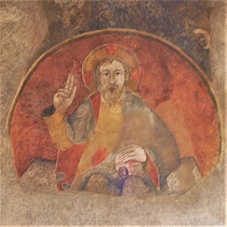 | Christ en majesté アプスのヴォールトに、12世紀に制作された「栄光のキリスト」、又はパントクラトールをあらわしたフレスコ画が見えます。マンドルラの中で、玉座に就いたキリストが右手で祝福のポーズをしています。 このフレスコ画は壁の上塗りの下に埋もれていて、19世紀末の教会堂内部で実施された修復工事の際に、発見されました。 On trouve la fresque du Christ en majesté ou le Pantocrator datant du 12e siècle, sur la voûte en cul-de-four de l'abside. Bénissant de la main droite, le Christ est assis sur un trône dans une mandorle. Cachée par l'enduit, elle a été mise au jour lors des restaurations d'intérieur à la fin du 19e siècle. |