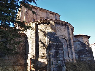 Chevet 半円プランのアプスは2つの大きなバットレスで補強されています。アプスと2つの後陣祭室の瓦の屋根は、モディヨンがあるコルニッシュに支えられています。 L'abside hémicirculaire est renforcée de deux gros contreforts. Les toitures en tuile de l'abside et de deux absidioles, sont supportées de la corniche à modillons. |