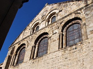 | Croisillon sud 南翼廊は、ロマネスクの特徴がより残されています。 幾何学モティーフの装飾の上に、半円型の開口部が2層になっていて、開口部は多色の中石と、植物モティーフの柱頭彫刻がある小円柱で装飾されています。この他、幾何学モティーフや花モティーフのモザイクも見られます。 Le croisillon sud préserve bien ses caractères romans. Au-dessus du cordon de billettes, se trouvent deux niveaux des baies en plein cintre, ornées de claveaux polychromes et de colonnettes à chapiteaux sculptés de motifs végétaux. On retrouve également le décor de mosaïque de motifs géométriques et de rosaces. |